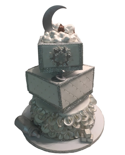 A white & silver winter wonderland baby shower cake. This 3 tier cake was created for a baby shower held at a private yacht club in Brooklyn, NY. A wonderful party planner and very talented host set the scene for a true party experience. The baby moon topper was created out of polymer clay to serve as a lasting memory.