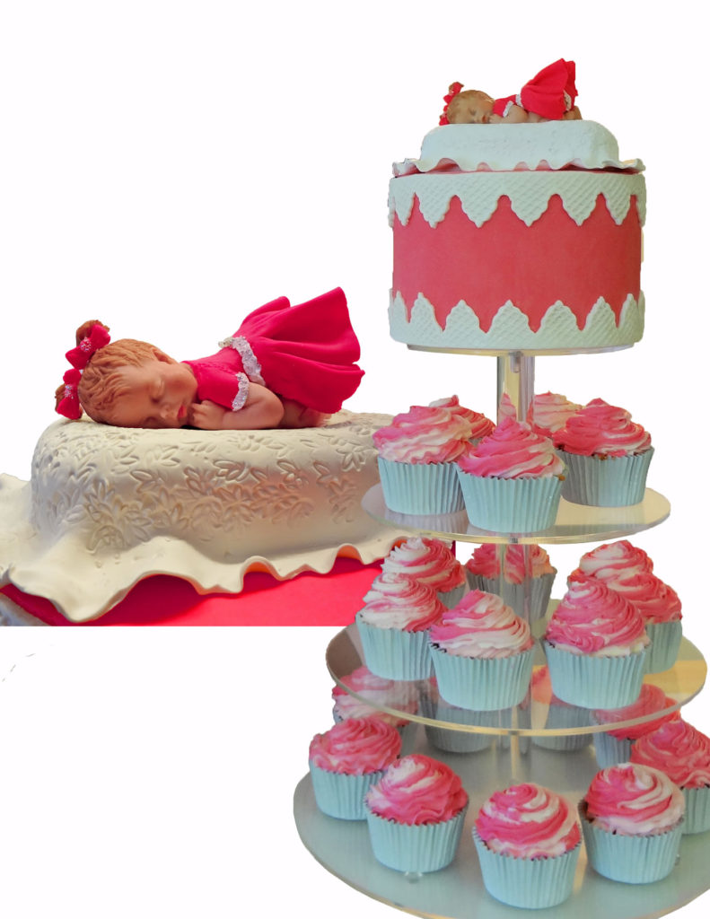 pink_cupcake_tower_baby_topper_1800px Published September 26, 2016 at 1390 × 1800 in Baby Girl Baby Shower Cake with cupcakes and custom topper