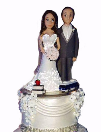 - This wedding cake topper shows details of the activities of the bride and the groom such as the books at the bride’s feet and the bus by the groom’s feet. Makes a great keepsake!