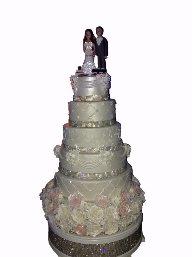The figures are made from clay so the couple can keep them forever. The cake is two different flavors red velvet with a cream cheese frosting and a vanilla bean cake with a fresh raspberry buttercream covered in white fondant with gum paste roses.